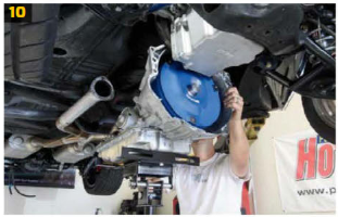 We poured some fluid in the Chevrolet Performance torque converter (PN 19299802) and mated it to the 4L65E transmission. With that done we raised it under the Chevelle. We did find that a few "clearancing" of the passage with a sledge was required, yet not a ton.
